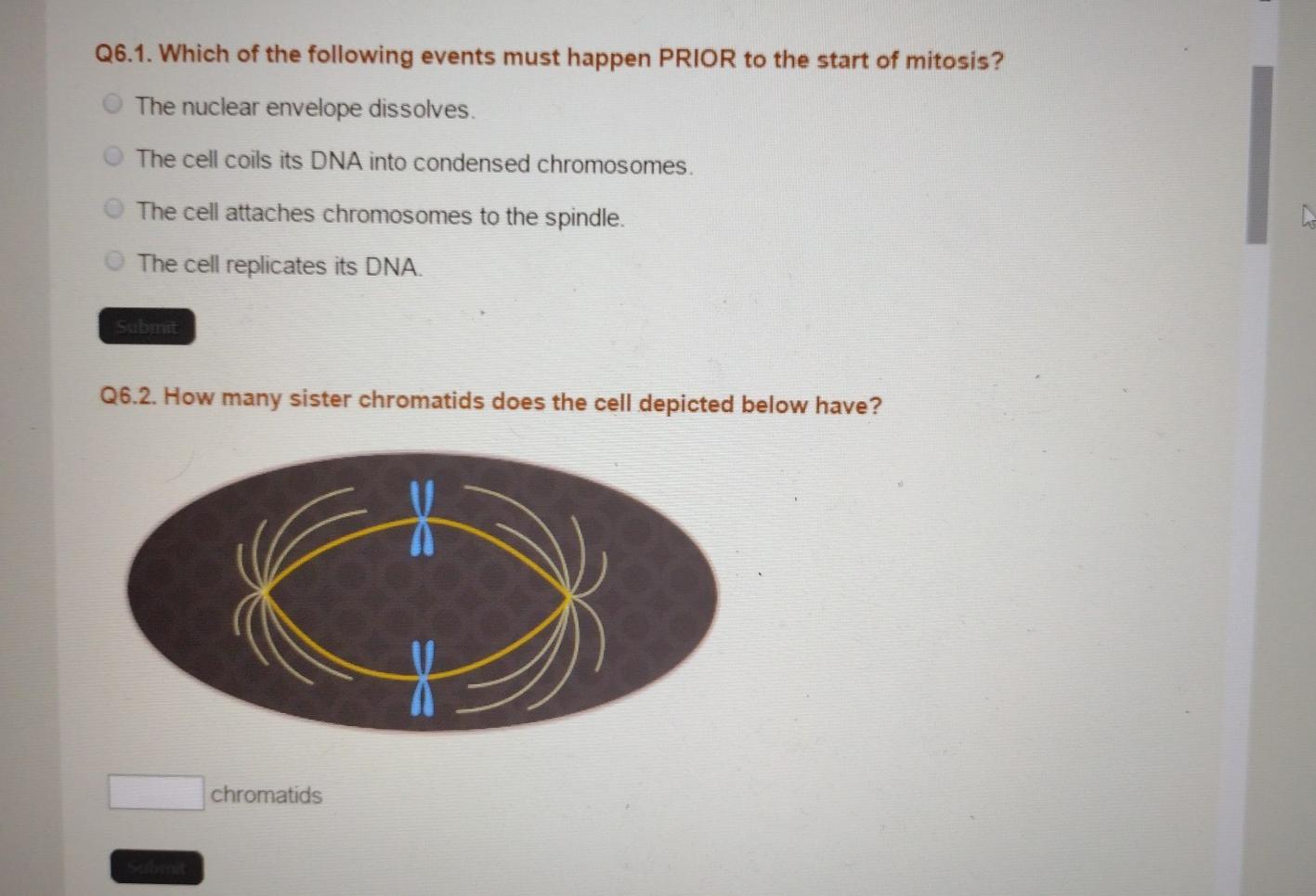 Which of the following events characterizes metaphase of mitosis. Which of the following happens prior to prophase of mitosis. The chromosomes must be duplicated.